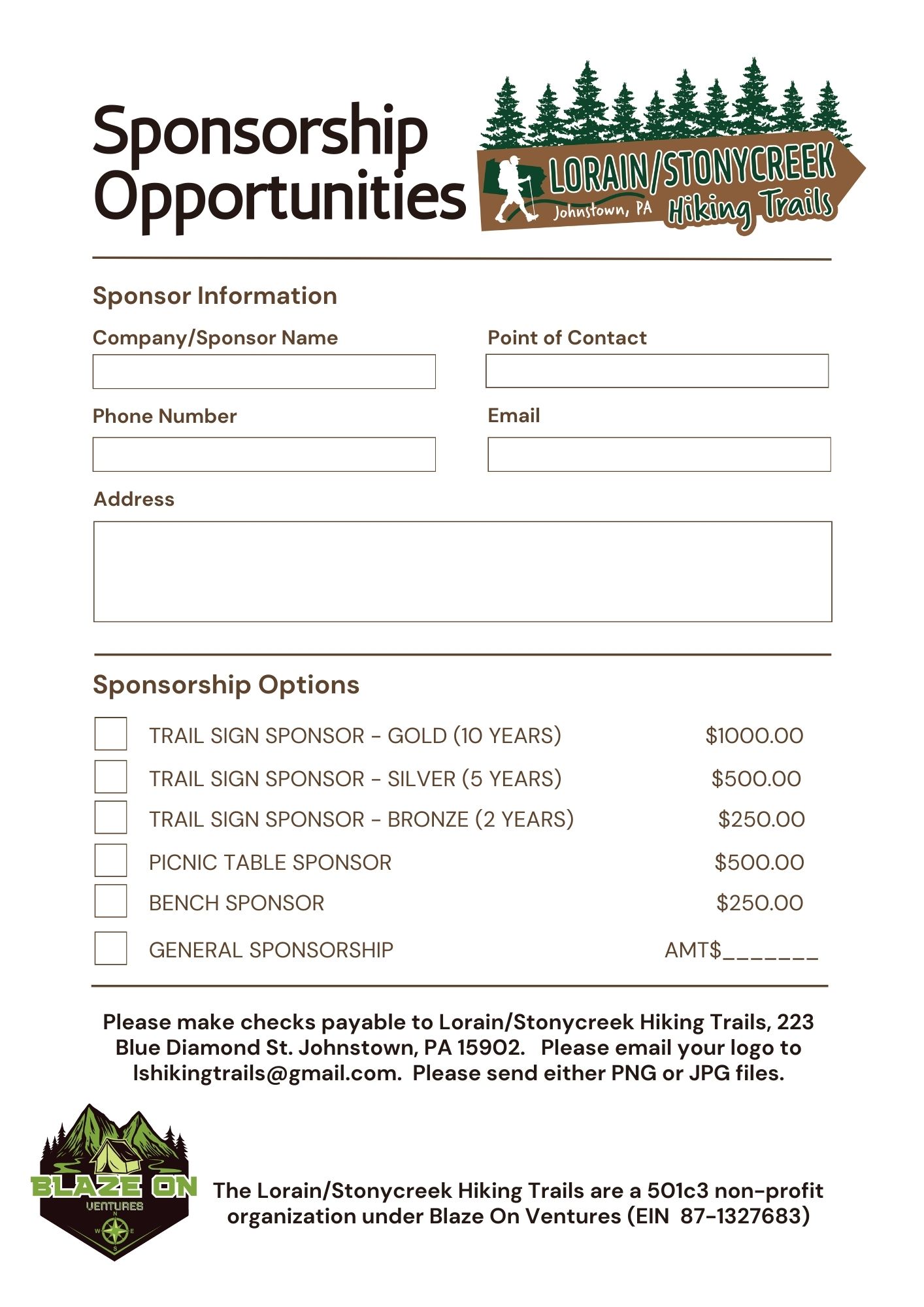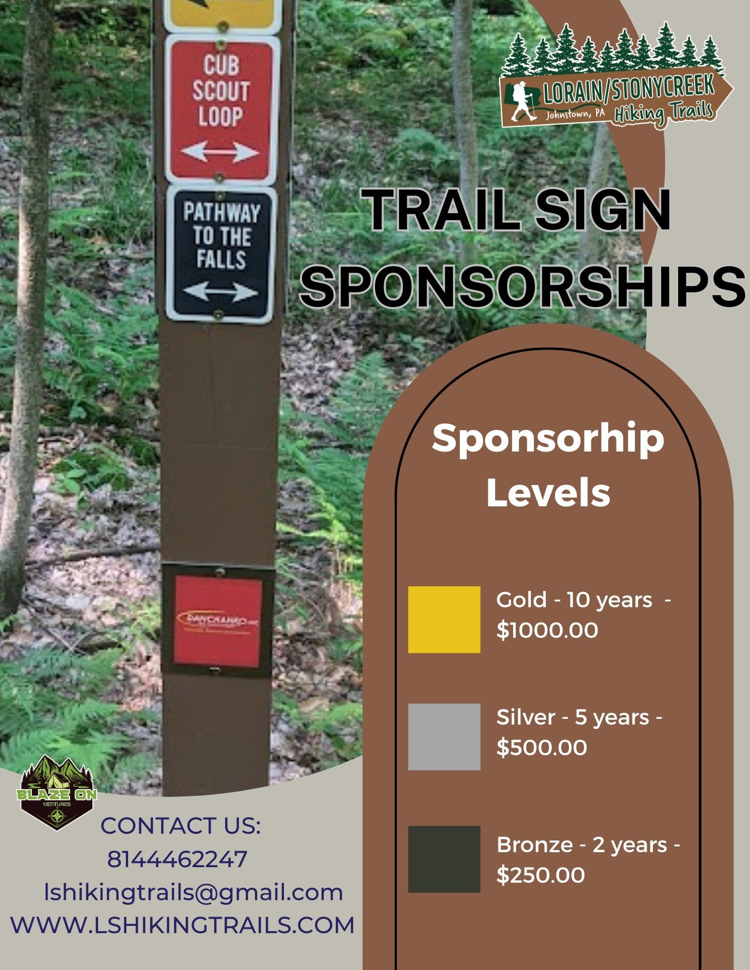 The Lorain/Stonycreek Hiking Trails have 33 Signposts in our trails with the possibility of adding two more in the spring. We have a 3-tier sponsorship for each one. Gold, Silver and Bronze. You would get a 4x3.5” sign plaque just like our trail signs with your business logo on it and the sponsorship level will be around the outer border.